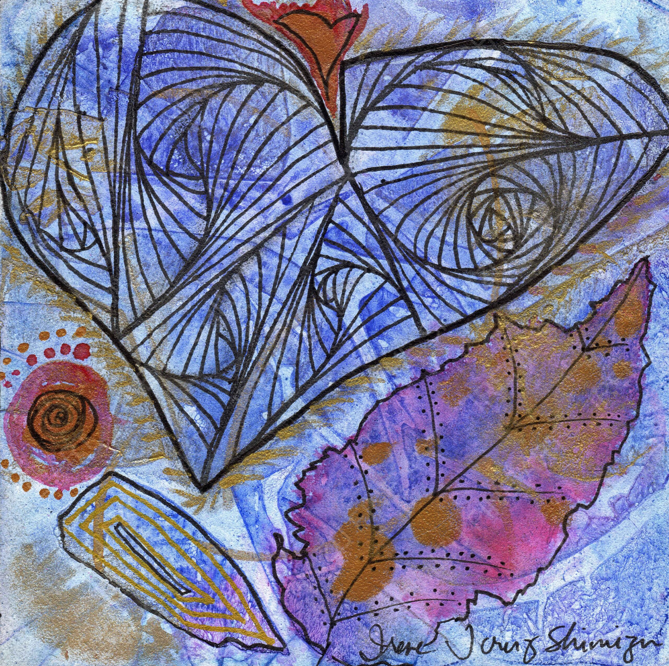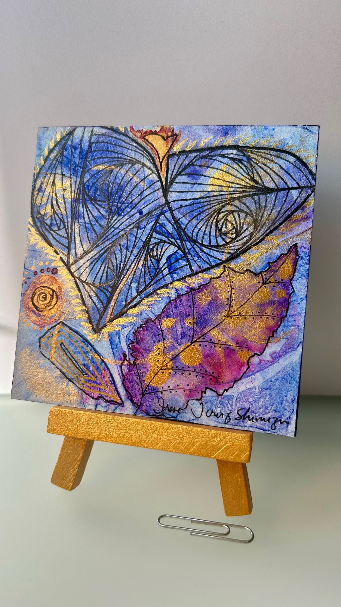 Gouache, fountain pen ink, metallic watercolor, and pen on a museum quality wooden panel.