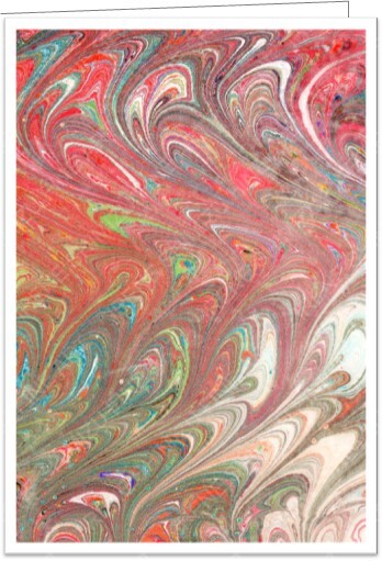 The cards in the “MARBLED” series are made with many drops of ink. I make each painting drop by drop. After all the drops have been laid onto the water bath, I create ethereal, unique marbled patterns by manipulating the paints with a comb, rake, or stylus. The flow of the patterns comes from the nudges I receive from the Universe. I like to envision another dimension or realm as I create these beautiful marbled patterns. Come flow with me!