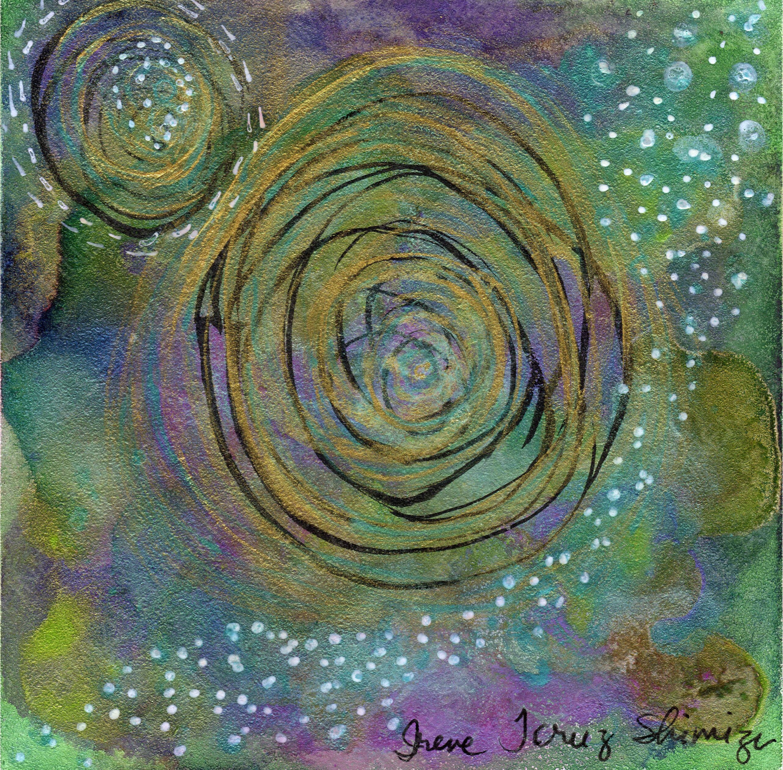 Metallic acrylics, oil pastels, and metallic watercolor on a museum-quality wood panel.