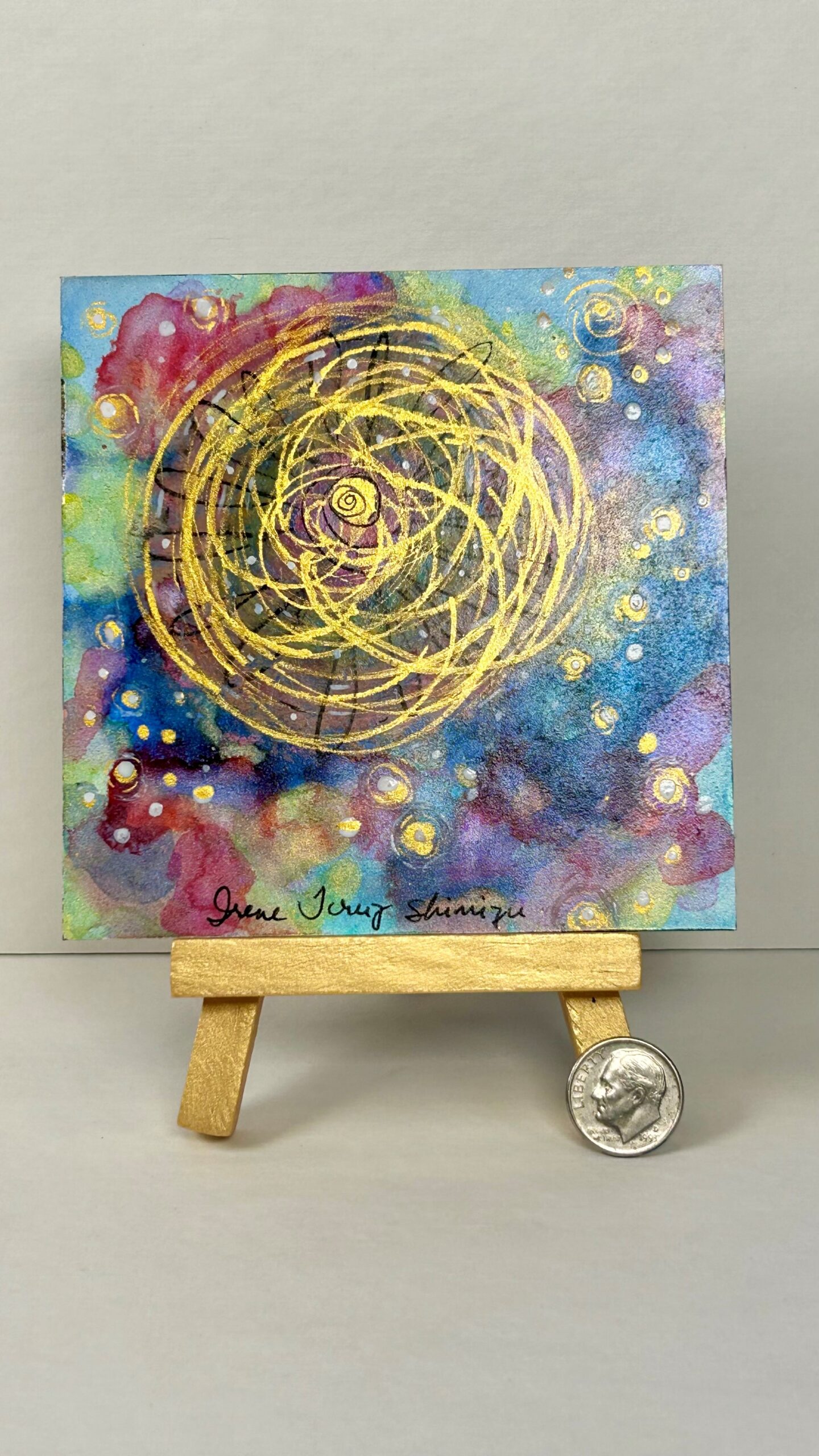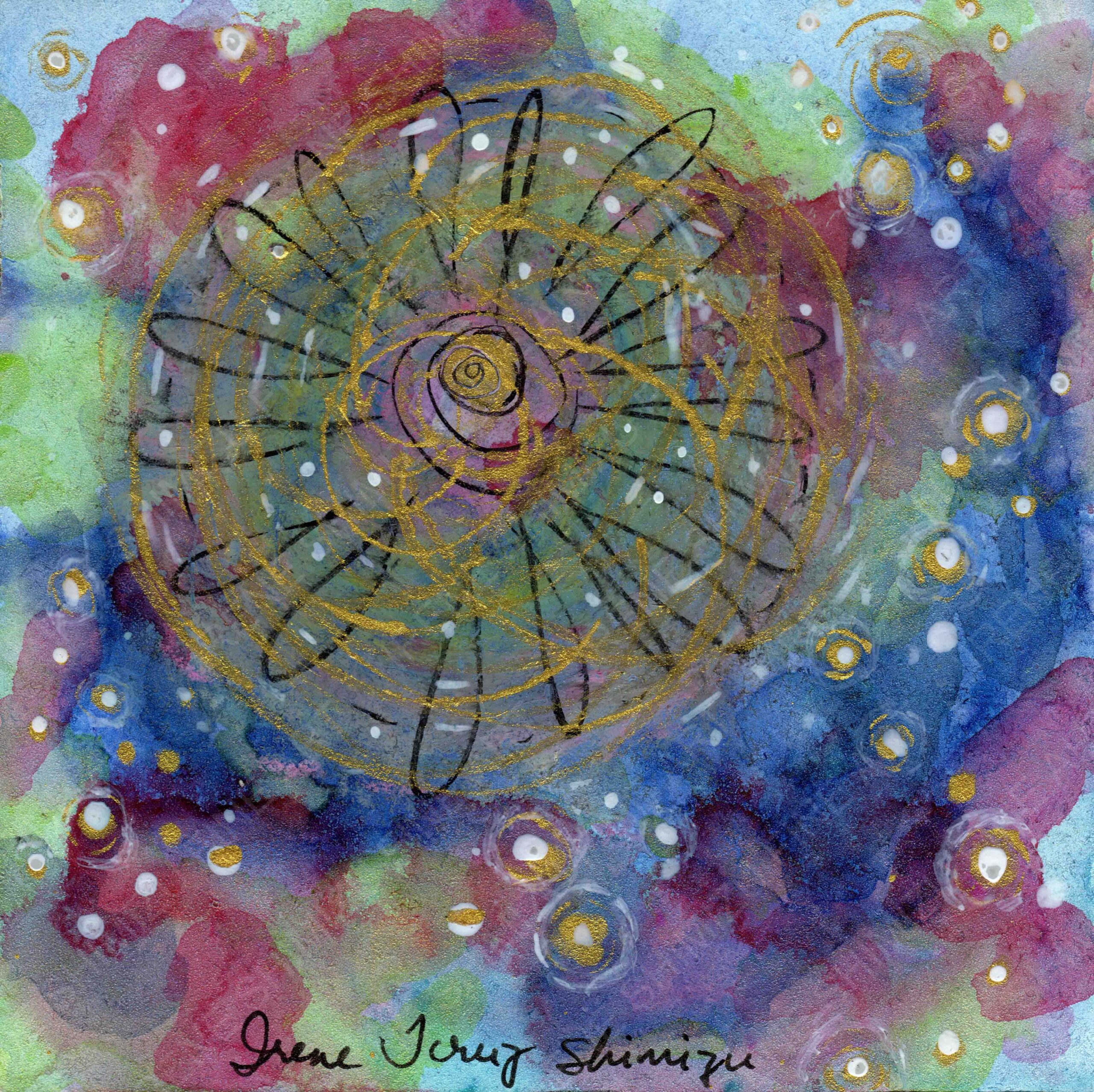 Metallic acrylics, oil pastels, and metallic watercolor on a museum-quality wood panel.