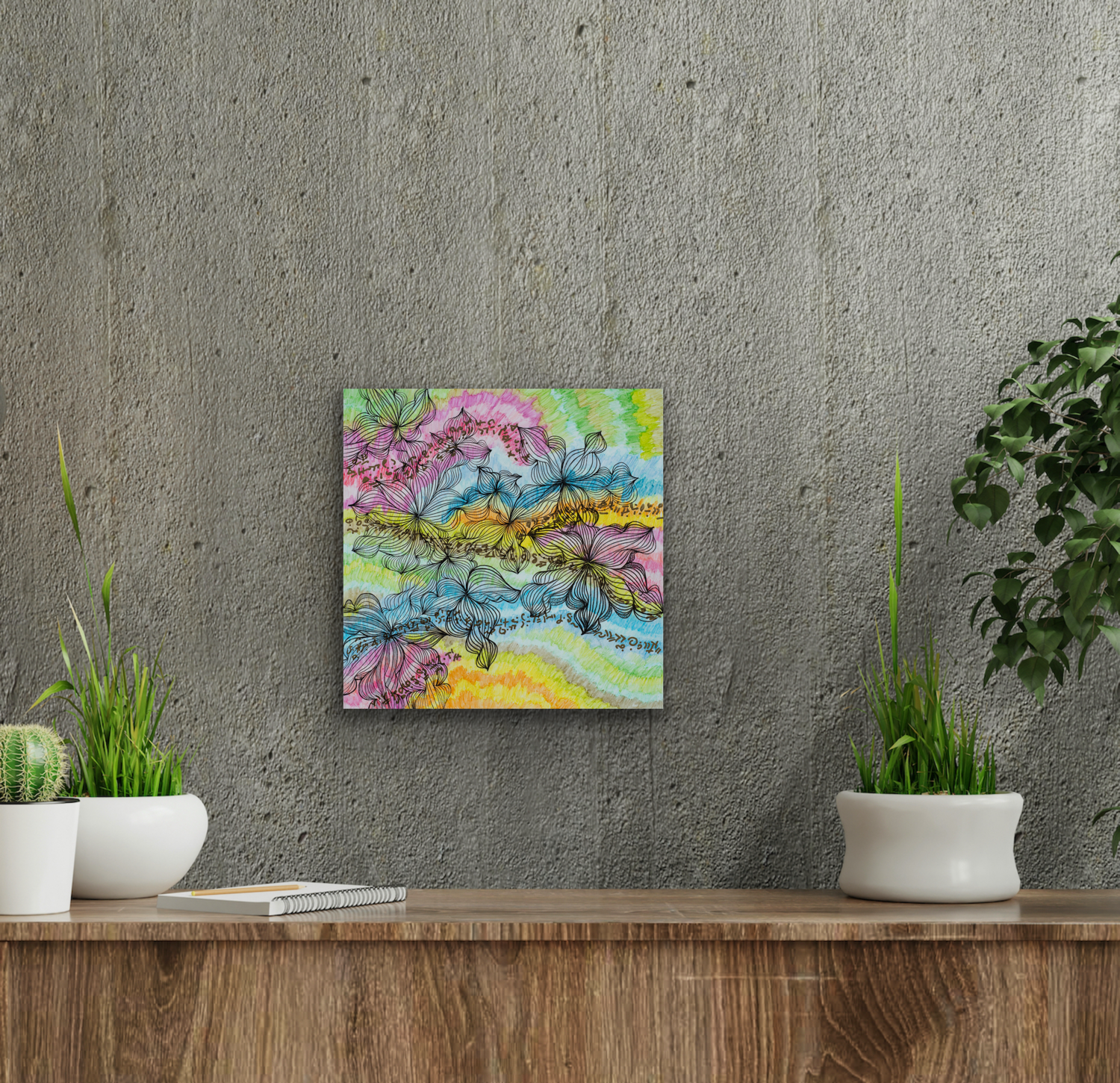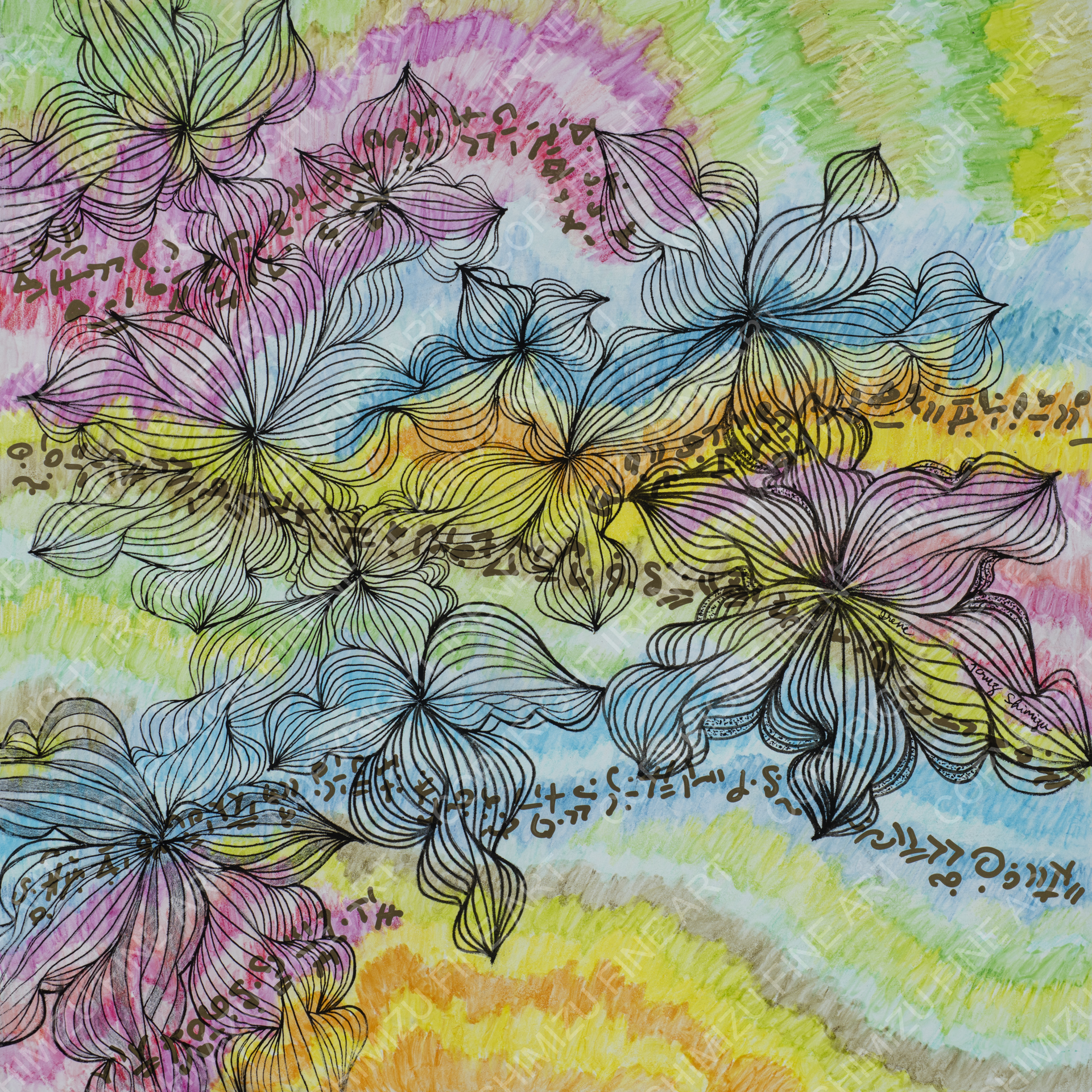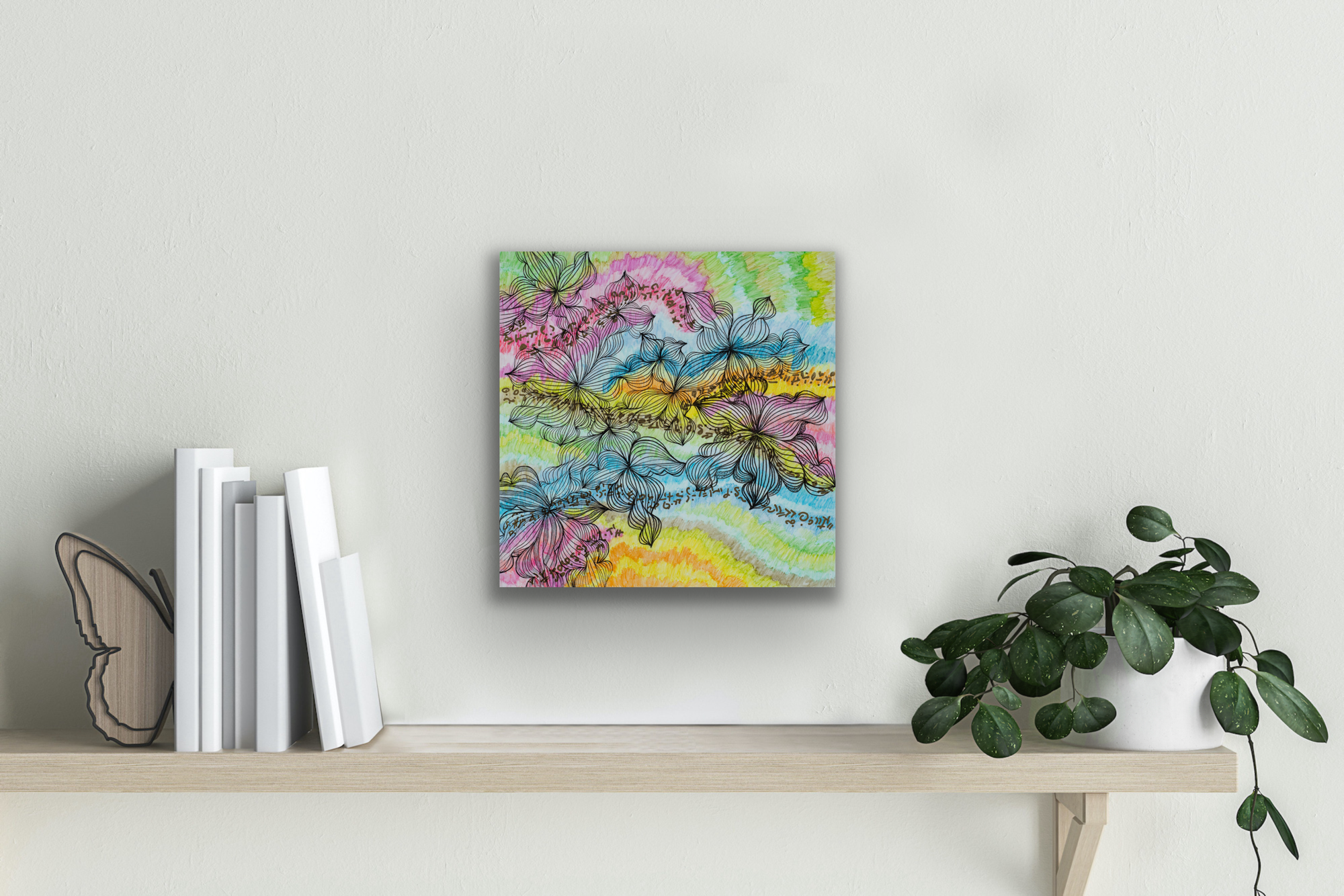 Watercolor pencils, acrylic, and ink; mounted on premium cradled wood board.