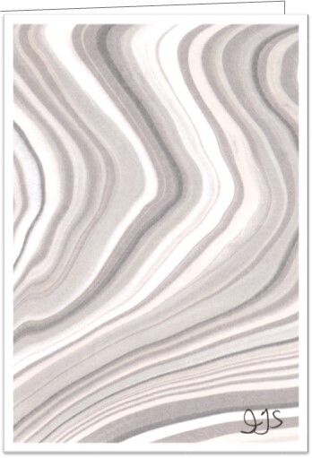 The cards in the “Suminagashi” series are made with many drops of ink released from a paintbrush or dropper, by hand, onto water. I make each painting drop by drop.  Sometimes 100 – 200 drops of ink are used to create a final pattern.